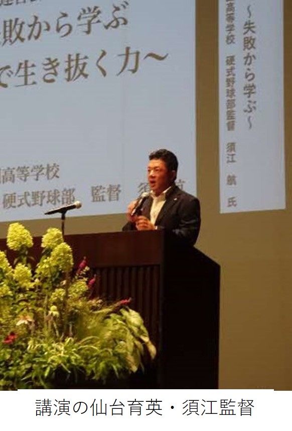 2日目はアトラクション(「白A」によるプロジェクションマッピング)からスタートし、その後の表彰式では、県高P連元会長の石川直哉様へPTA活動振興功労者表彰、郡山高等学校父母と教師の会へ全国大会会長団体表彰、県高P連元会長の原正幸様へ役員表彰者特別感謝状がそれぞれ授与されました。続いて、2022年度の夏の甲子園を沸かせた仙台育英学園高等学校硬式野球部監督の須江航氏による講演会「伝わる言葉~失敗から学ぶ~」では、甲子園での決勝の2日後の講演という強行日程にも関わらず、元気な姿でこれまでの監督としての指導者人生を振り返り、自身の様々な体験から得た教訓などを紹介していただき、我々保護者としても大いに参考になることばかりでした。